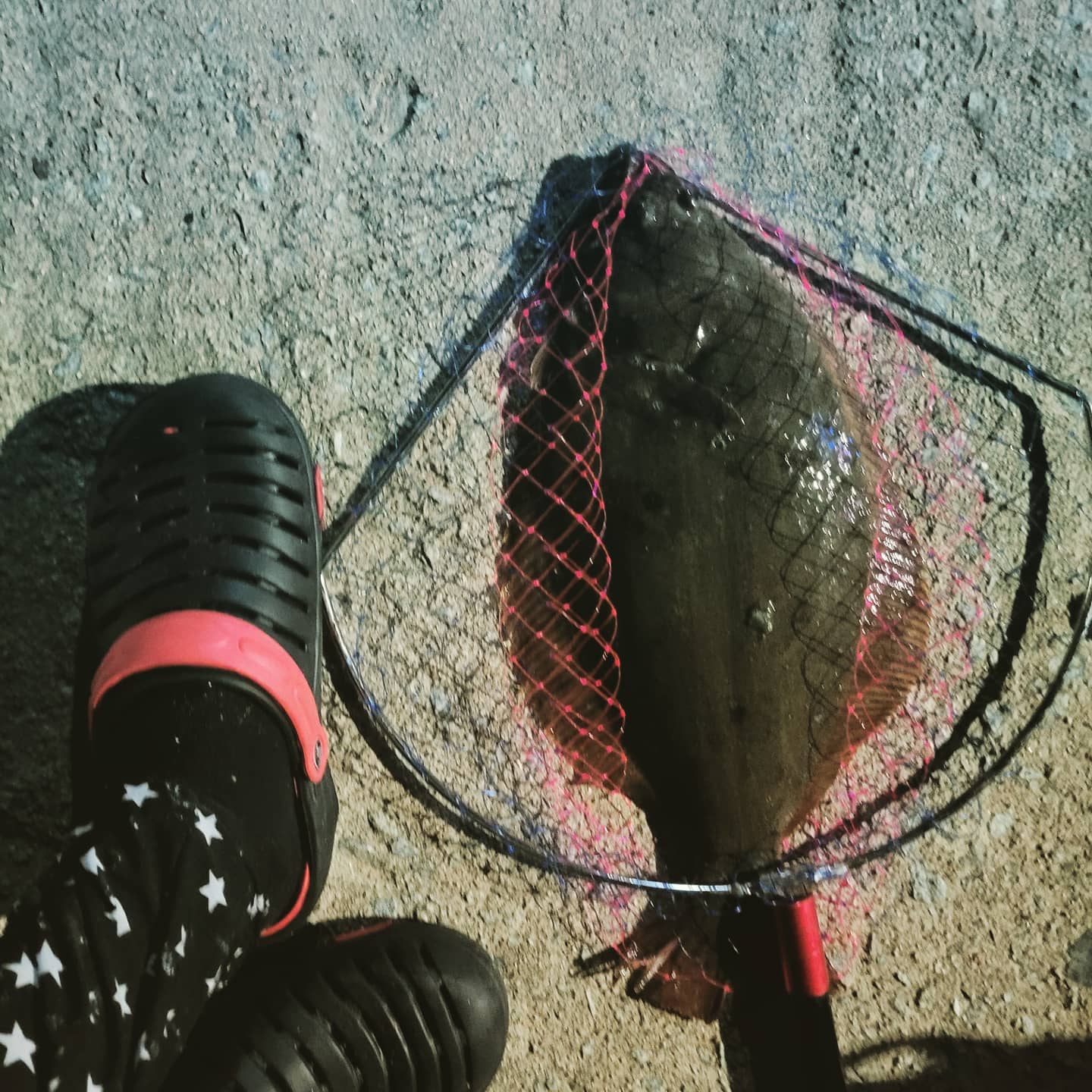 간조가 21시50분 정도였는데 늦게 도착해서 21시에 진입을 하였습니다. 물은 한참 빠져있네요. 마음이 급해 서둘렀습니다. 도다리인가 2마리, 대하 1 마리 잡고 광어를 잡고 나니 담을 곳이 없어서 어쩔 수 없이 철수했습니다. 많이 아쉽지만 조과통을 챙기지 못한 내 불찰이니 이거에 만족하기로 했습니다.